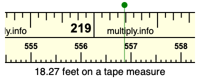 18.27 feet times 12 equals 219.24 inches. Therefore, 18.27 feet is at the 219.24 inches place on the tape measure, as displayed below.