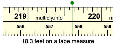 18.3 feet times 12 equals 219.6 inches. Therefore, 18.3 feet is at the 219.6 inches place on the tape measure, as displayed below.