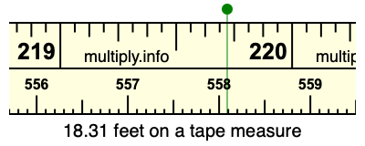 18.31 feet times 30.48 equals 558.0888 centimeters. Therefore, 18.31 feet is also at the 558.0888 centimeters place on the tape measure, as displayed above.