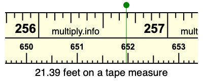 21.39 feet times 12 equals 256.68 inches. Therefore, 21.39 feet is at the 256.68 inches place on the tape measure, as displayed below.