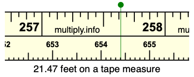 21.47 feet times 12 equals 257.64 inches. Therefore, 21.47 feet is at the 257.64 inches place on the tape measure, as displayed below.