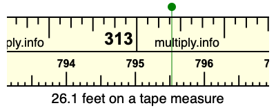 26.1 feet times 12 equals 313.2 inches. Therefore, 26.1 feet is at the 313.2 inches place on the tape measure, as displayed below.
