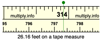 26.16 feet times 12 equals 313.92 inches. Therefore, 26.16 feet is at the 313.92 inches place on the tape measure, as displayed below.
