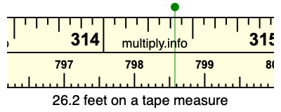 26.2 feet times 12 equals 314.4 inches. Therefore, 26.2 feet is at the 314.4 inches place on the tape measure, as displayed below.