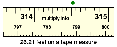 26.21 feet times 30.48 equals 798.8808 centimeters. Therefore, 26.21 feet is also at the 798.8808 centimeters place on the tape measure, as displayed above.
