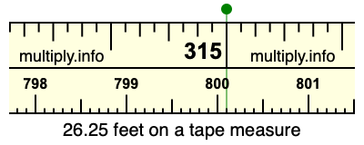 26.25 feet times 12 equals 315 inches. Therefore, 26.25 feet is at the 315 inches place on the tape measure, as displayed below.