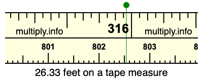 26.33 feet times 12 equals 315.96 inches. Therefore, 26.33 feet is at the 315.96 inches place on the tape measure, as displayed below.