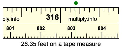 26.35 feet times 12 equals 316.2 inches. Therefore, 26.35 feet is at the 316.2 inches place on the tape measure, as displayed below.