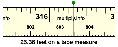 26.36 feet times 12 equals 316.32 inches. Therefore, 26.36 feet is at the 316.32 inches place on the tape measure, as displayed below.