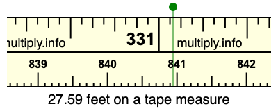 27.59 feet times 30.48 equals 840.9432 centimeters. Therefore, 27.59 feet is also at the 840.9432 centimeters place on the tape measure, as displayed above.