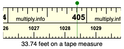 33.74 feet times 12 equals 404.88 inches. Therefore, 33.74 feet is at the 404.88 inches place on the tape measure, as displayed below.