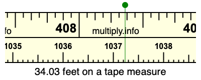 34.03 feet times 30.48 equals 1037.2344 centimeters. Therefore, 34.03 feet is also at the 1037.2344 centimeters place on the tape measure, as displayed above.