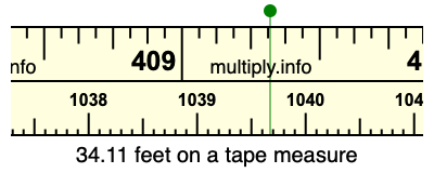 34.11 feet times 12 equals 409.32 inches. Therefore, 34.11 feet is at the 409.32 inches place on the tape measure, as displayed below.