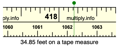 34.85 feet times 12 equals 418.2 inches. Therefore, 34.85 feet is at the 418.2 inches place on the tape measure, as displayed below.