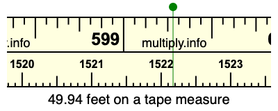 49.94 feet times 30.48 equals 1522.1712 centimeters. Therefore, 49.94 feet is also at the 1522.1712 centimeters place on the tape measure, as displayed above.