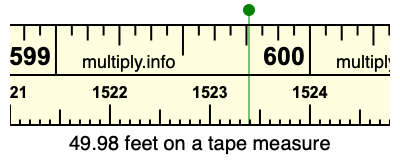 49.98 feet times 12 equals 599.76 inches. Therefore, 49.98 feet is at the 599.76 inches place on the tape measure, as displayed below.