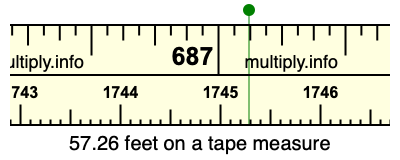 57.26 feet times 12 equals 687.12 inches. Therefore, 57.26 feet is at the 687.12 inches place on the tape measure, as displayed below.