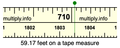 59.17 feet times 12 equals 710.04 inches. Therefore, 59.17 feet is at the 710.04 inches place on the tape measure, as displayed below.