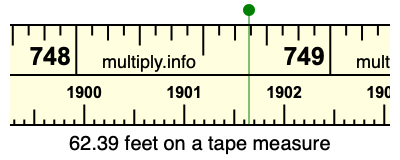 62.39 feet times 12 equals 748.68 inches. Therefore, 62.39 feet is at the 748.68 inches place on the tape measure, as displayed below.