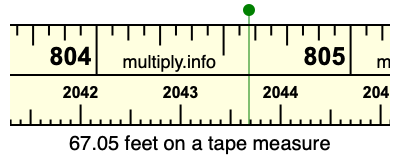 67.05 feet times 12 equals 804.6 inches. Therefore, 67.05 feet is at the 804.6 inches place on the tape measure, as displayed below.