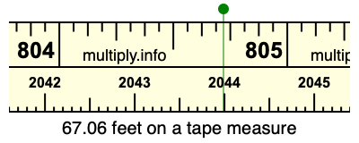 67.06 feet times 30.48 equals 2043.9888 centimeters. Therefore, 67.06 feet is also at the 2043.9888 centimeters place on the tape measure, as displayed above.