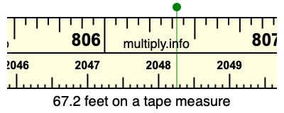 67.2 feet times 12 equals 806.4 inches. Therefore, 67.2 feet is at the 806.4 inches place on the tape measure, as displayed below.
