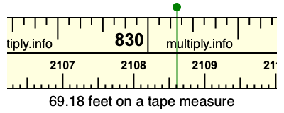 69.18 feet times 12 equals 830.16 inches. Therefore, 69.18 feet is at the 830.16 inches place on the tape measure, as displayed below.