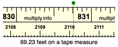 69.23 feet times 30.48 equals 2110.1304 centimeters. Therefore, 69.23 feet is also at the 2110.1304 centimeters place on the tape measure, as displayed above.