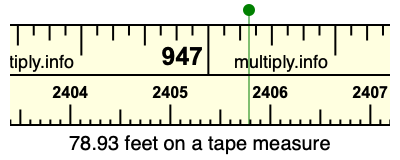 78.93 feet times 12 equals 947.16 inches. Therefore, 78.93 feet is at the 947.16 inches place on the tape measure, as displayed below.