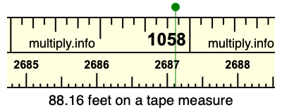 88.16 feet times 12 equals 1057.92 inches. Therefore, 88.16 feet is at the 1057.92 inches place on the tape measure, as displayed below.