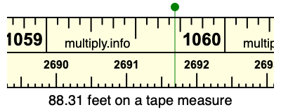 88.31 feet times 30.48 equals 2691.6888 centimeters. Therefore, 88.31 feet is also at the 2691.6888 centimeters place on the tape measure, as displayed above.