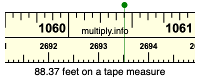 88.37 feet times 30.48 equals 2693.5176 centimeters. Therefore, 88.37 feet is also at the 2693.5176 centimeters place on the tape measure, as displayed above.