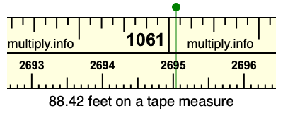 88.42 feet times 12 equals 1061.04 inches. Therefore, 88.42 feet is at the 1061.04 inches place on the tape measure, as displayed below.