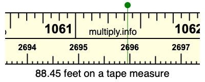 88.45 feet times 12 equals 1061.4 inches. Therefore, 88.45 feet is at the 1061.4 inches place on the tape measure, as displayed below.
