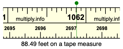 88.49 feet times 30.48 equals 2697.1752 centimeters. Therefore, 88.49 feet is also at the 2697.1752 centimeters place on the tape measure, as displayed above.