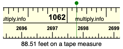 88.51 feet times 12 equals 1062.12 inches. Therefore, 88.51 feet is at the 1062.12 inches place on the tape measure, as displayed below.
