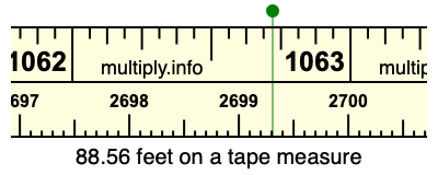 88.56 feet times 12 equals 1062.72 inches. Therefore, 88.56 feet is at the 1062.72 inches place on the tape measure, as displayed below.