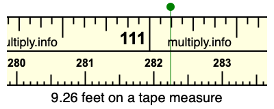 9.26 feet times 12 equals 111.12 inches. Therefore, 9.26 feet is at the 111.12 inches place on the tape measure, as displayed below.