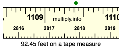 92.45 feet times 30.48 equals 2817.876 centimeters. Therefore, 92.45 feet is also at the 2817.876 centimeters place on the tape measure, as displayed above.