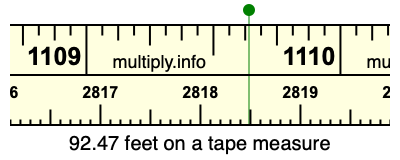 92.47 feet times 12 equals 1109.64 inches. Therefore, 92.47 feet is at the 1109.64 inches place on the tape measure, as displayed below.
