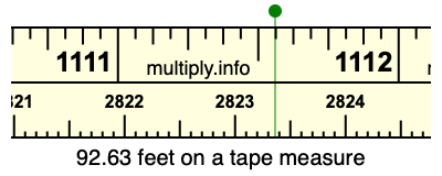 92.63 feet times 30.48 equals 2823.3624 centimeters. Therefore, 92.63 feet is also at the 2823.3624 centimeters place on the tape measure, as displayed above.