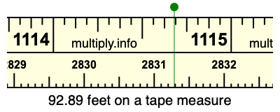 92.89 feet times 12 equals 1114.68 inches. Therefore, 92.89 feet is at the 1114.68 inches place on the tape measure, as displayed below.