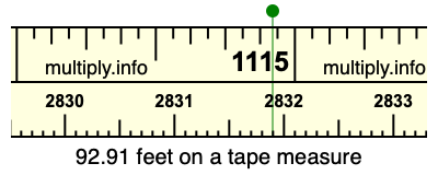 92.91 feet times 12 equals 1114.92 inches. Therefore, 92.91 feet is at the 1114.92 inches place on the tape measure, as displayed below.