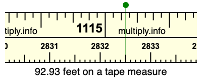 92.93 feet times 12 equals 1115.16 inches. Therefore, 92.93 feet is at the 1115.16 inches place on the tape measure, as displayed below.