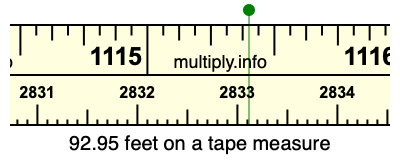 92.95 feet times 30.48 equals 2833.116 centimeters. Therefore, 92.95 feet is also at the 2833.116 centimeters place on the tape measure, as displayed above.