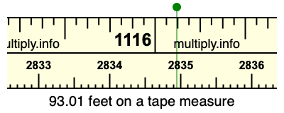 93.01 feet times 30.48 equals 2834.9448 centimeters. Therefore, 93.01 feet is also at the 2834.9448 centimeters place on the tape measure, as displayed above.