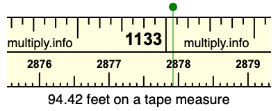 94.42 feet times 12 equals 1133.04 inches. Therefore, 94.42 feet is at the 1133.04 inches place on the tape measure, as displayed below.