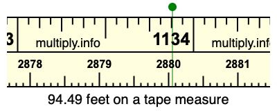 94.49 feet times 30.48 equals 2880.0552 centimeters. Therefore, 94.49 feet is also at the 2880.0552 centimeters place on the tape measure, as displayed above.