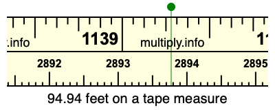 94.94 feet times 30.48 equals 2893.7712 centimeters. Therefore, 94.94 feet is also at the 2893.7712 centimeters place on the tape measure, as displayed above.