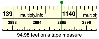 94.98 feet times 30.48 equals 2894.9904 centimeters. Therefore, 94.98 feet is also at the 2894.9904 centimeters place on the tape measure, as displayed above.